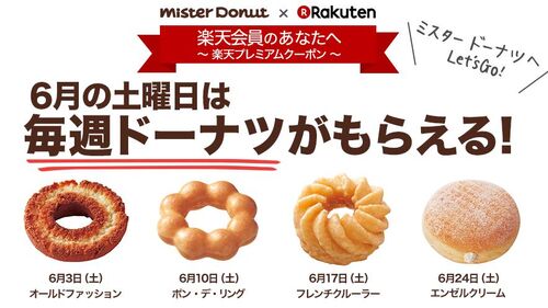【楽天会員限定】6月の土曜日はミスタードーナツがもらえる!【ミスド400円分】 楽天ポイントカード会員の人限定で楽天のプレミアムクーポンがもらえます! 6月の毎土曜日にミスドの商品と交換できるクーポンが配布されます。 (楽天会員情報にご登録され…