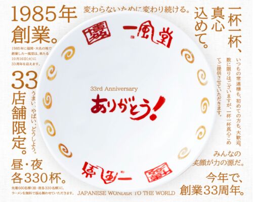 一風堂のラーメンが無料!10月16日創業33周年「振る舞いラーメン祭」! どうも「がんばらない節約ブログ」略して「がんせつ」です 今回は一風堂のラーメンが無料になる案件の紹介です 創業から33周年を記念して2018年10月16日(火)にて「振…
